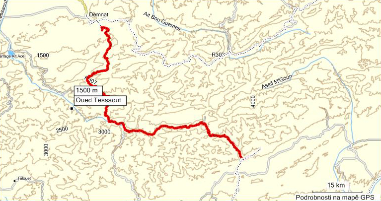 Uhýbáme z asfaltové cesty a vydáváme se „zkratkou“ na přejezd mezi Gorges du Dodes a Gorge du Todra. Dejv se mě ptá, o kolik si cestu zkrátíme.