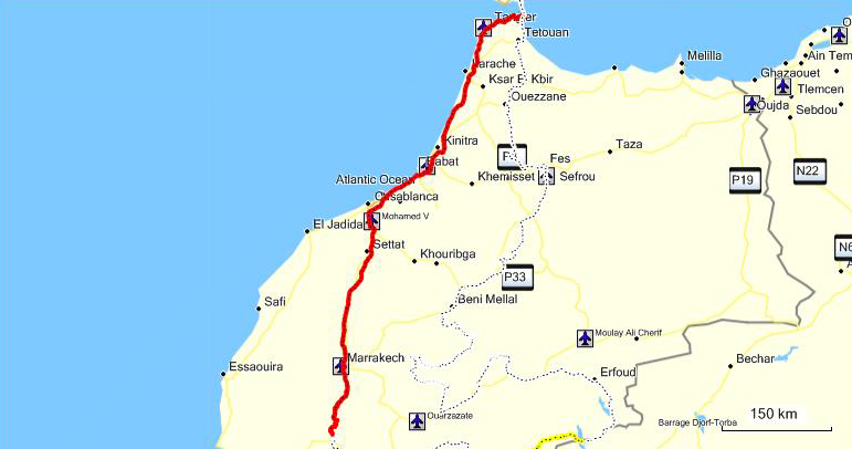 A jede se dál, napíchnem se na R 203 směrem na Asni, pak už rovnou na Marrákesch. Během cesty několikrát měníme plány dne a nakonec se rozhodujeme dneska dorazit někam za Tanger, přespat a ráno to doklepnout do Ceuty a odrazit od břehu směrem Evropa.