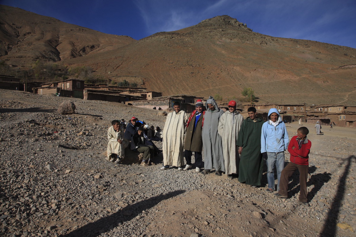 Údolí se táhne ještě několik kilometrů a pak jej opouštíme mohutným převýšením, opět stoupáme do hor. Atlas není právě přívětivé místo co se týče kvality cest, ale s tím počítáme. Ve vesnici Ichabken zastavujeme na návsi, chlapi se tu vyhřívají, zatímco ženy tahají vodu a spadané listí, podzim dorazil už i sem. Dávám se snimi do řeči, jde to ztuha, já francouzsky ani ťuk, oni zas anglicky bez šance. Ale máme ruce/nohy a hlavně úsměv, ne? :-) Daří se mi je přesvědčit k focení, konečně..